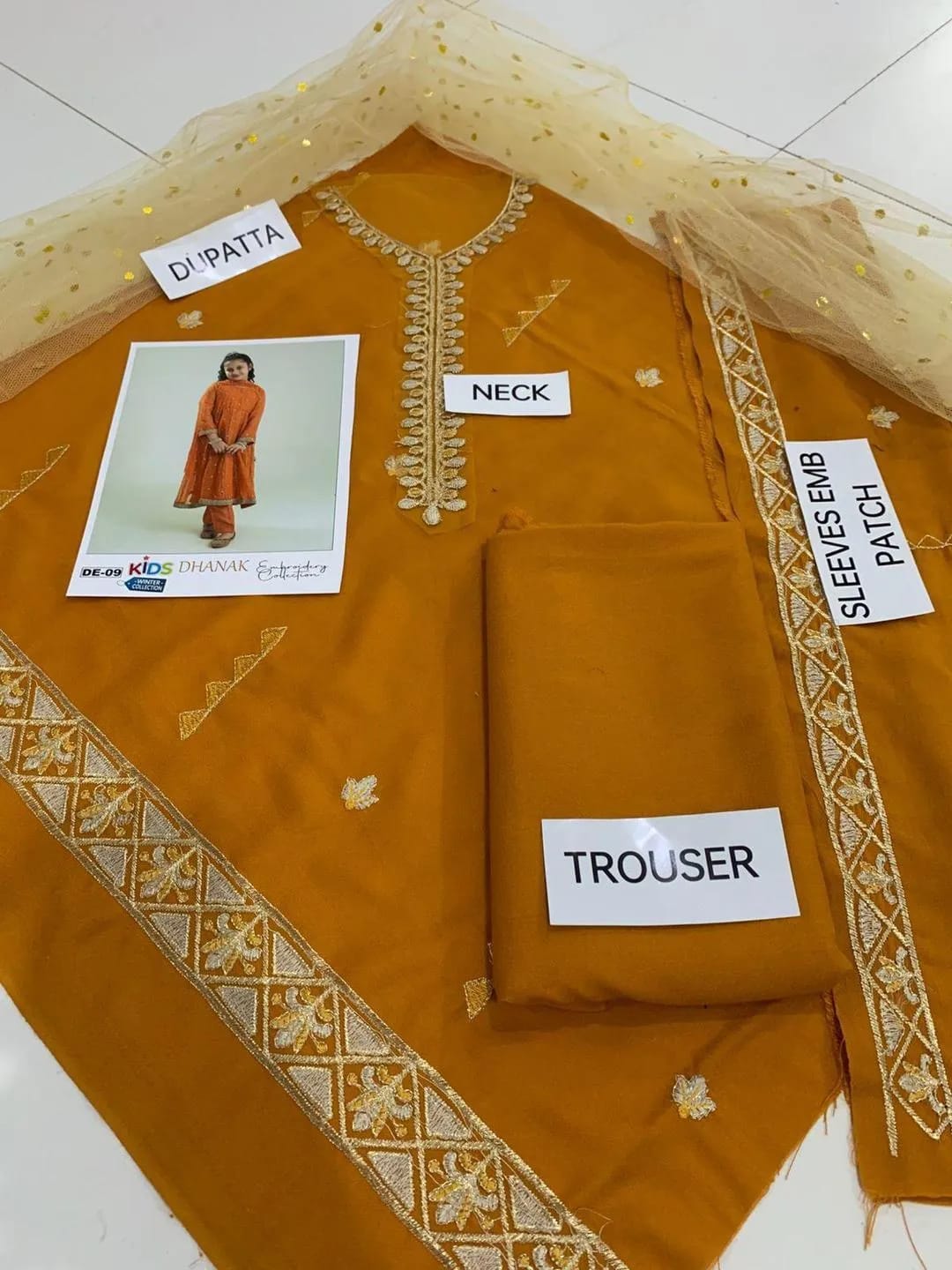 3 Pcs Girl’s Dhanak Embroidered Shirt And Trouser Suit