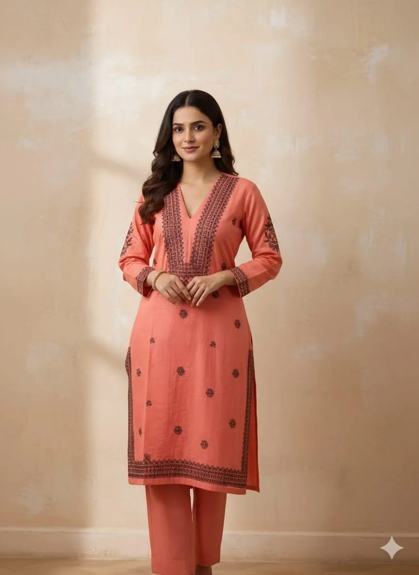 *Product Description*: Elevate your style with this enchanting Peach Linen Embroidered Suit. Designed for a modern woman, it features a classy V-Neck shirt along with plain cotton trousers and a beautifully printed dupatta. Available in Small, Medium, and Large, this 3 Pcs set is perfect for any occasion, combining comfort with sophistication.