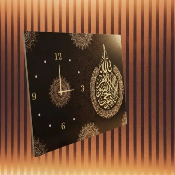 *Product Description*: Add a touch of sophistication to your home decor with this stunning 3D Wall Clock featuring beautiful Qul Calligraphy design. Crafted from durable MDF and equipped with an accurate quartz movement, it’s not just a timepiece but a piece of art that enhances any room. Perfect for creating a stylish and meaningful ambiance in your space.