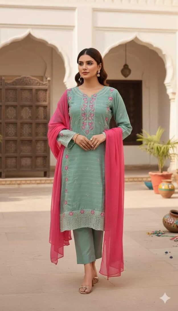 *Product Description*: Step into style with this stunning green linen stitched suit. Featuring an intricately embroidered shirt, plain trousers, and a delicate chiffon dupatta, this 3-piece set is perfect for any occasion. Available in small and medium sizes, it offers both comfort and elegance, making it a must-have addition to your wardrobe.